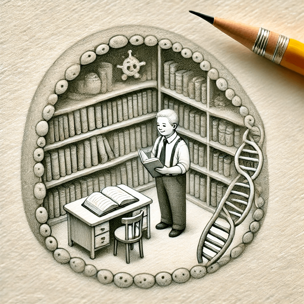 This idea represents a single cell containing a nucleus, where DNA is stored. The “library” is an excellent metaphor for the nucleus, and the “book” represents the DNA, which contains the instructions for making proteins and other cellular components. So far, this makes sense!