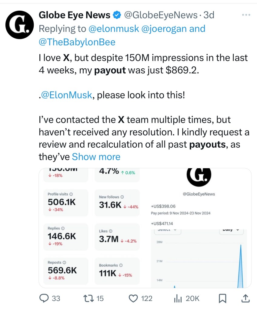 Recently, some X users have taken to X (where else!) to complain about what they perceive as an unfair payment scheme, prompting Elon Musk to send one of his deputies to clarify the situation. Users like Globe Eye News and Leonarda Jonie have raised concerns about low payouts despite achieving significant metrics on the platform. (see the attached images). Elon’s clarification deserves some careful thought—not so much about X’s pay scheme, but rather what the implications of the payment system at X mean regarding the much hyped “You are the media now!”?
