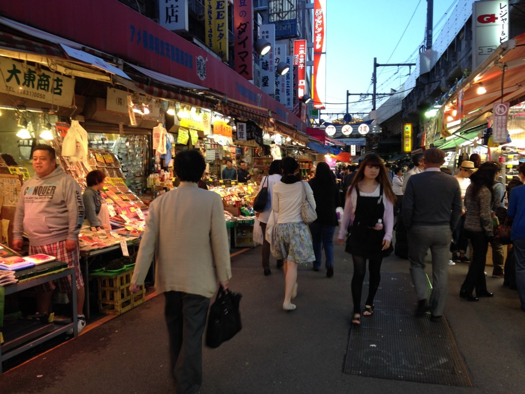 东京的上野,黄昏时分。没有看见鲁迅先生讲的上野的樱花。快五月中旬了吧,已经过了樱花的季节。夕阳西下。高架铁路在右手边,高架桥底下两边,商铺林立,熙熙攘攘。