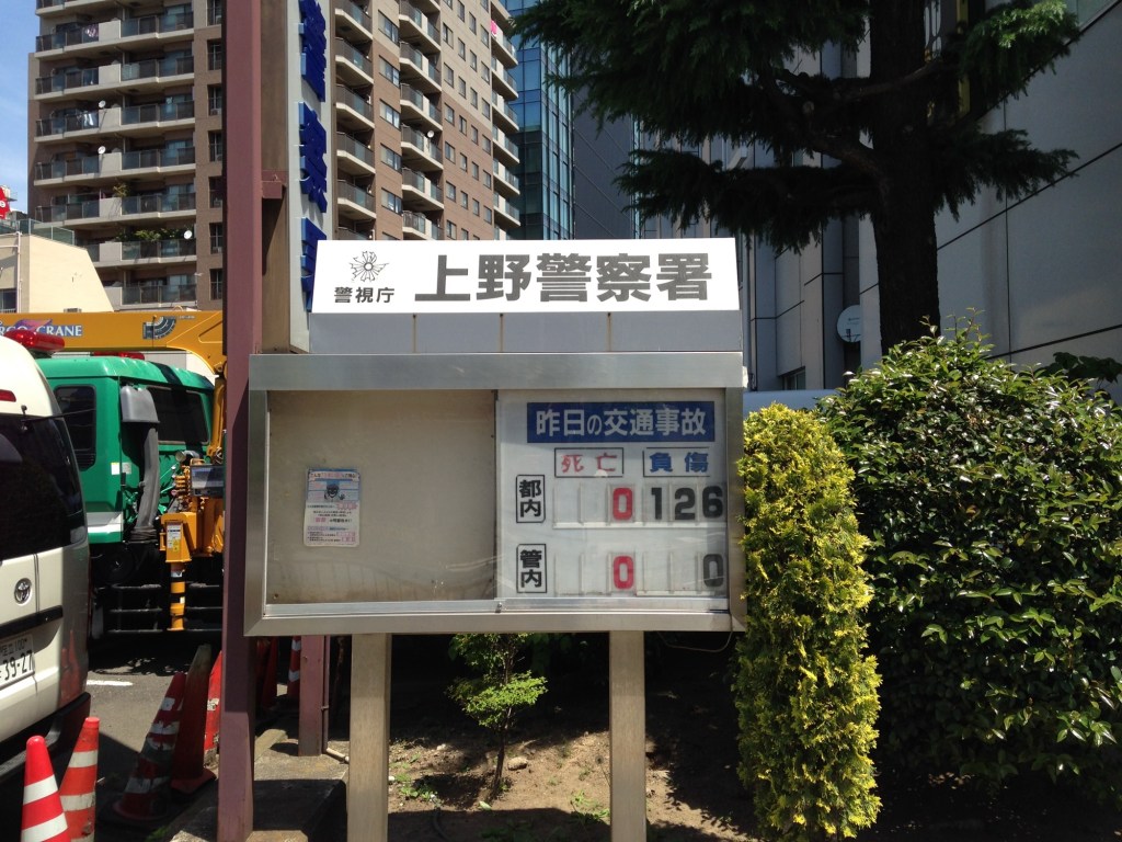 你要是去上野,负伤了,一定要去上野警察署报告一下,这样上野警察署好及时更新它的公告栏: “负伤:127.” (“ふしょうしゃ: 127にん,” or “Fushō-sha: 127 nin”)