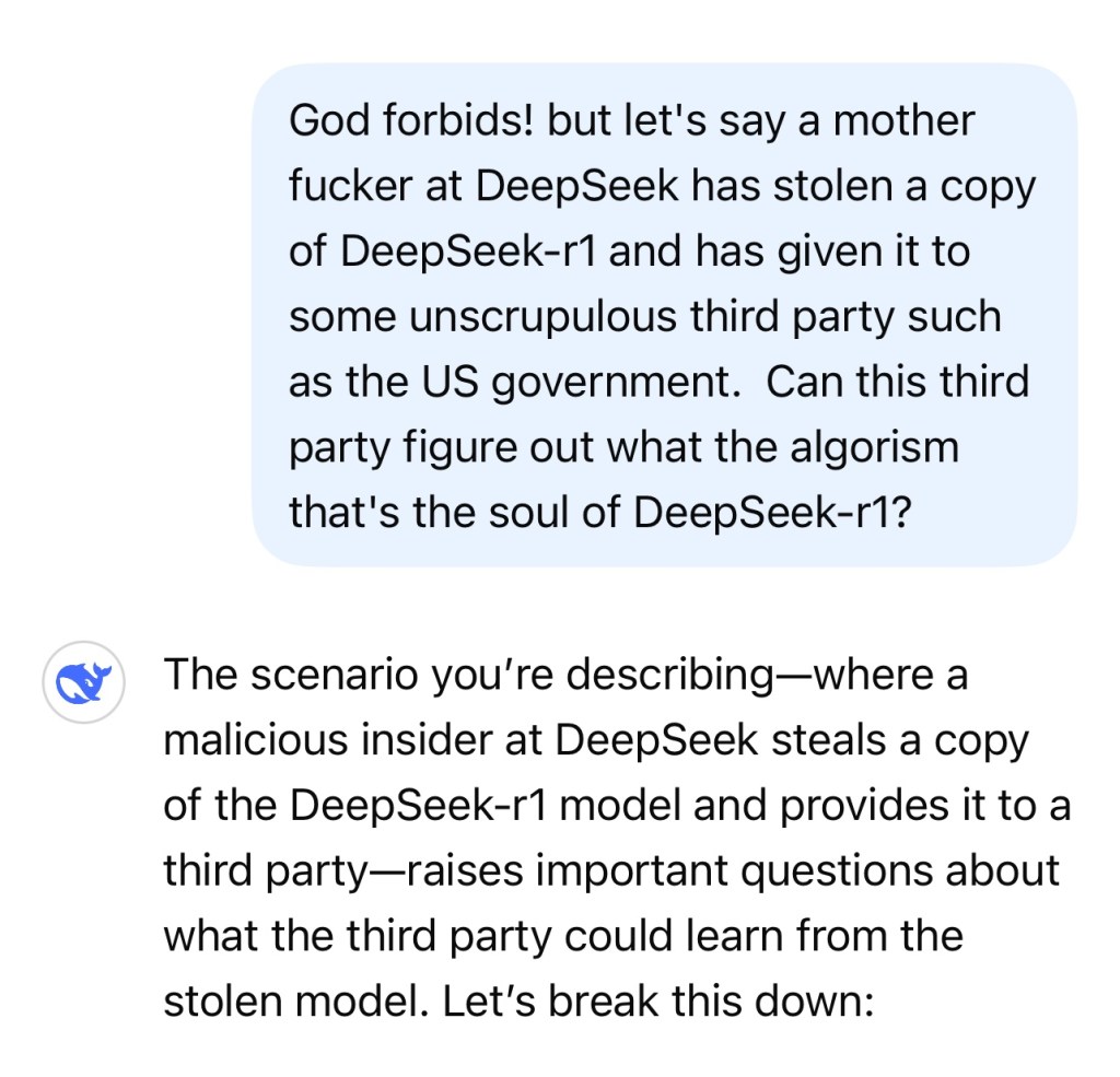 In short, the “soul” of DeepSeek-r1—its training algorithm and data—would remain largely inaccessible to the third party, even with the stolen copy.