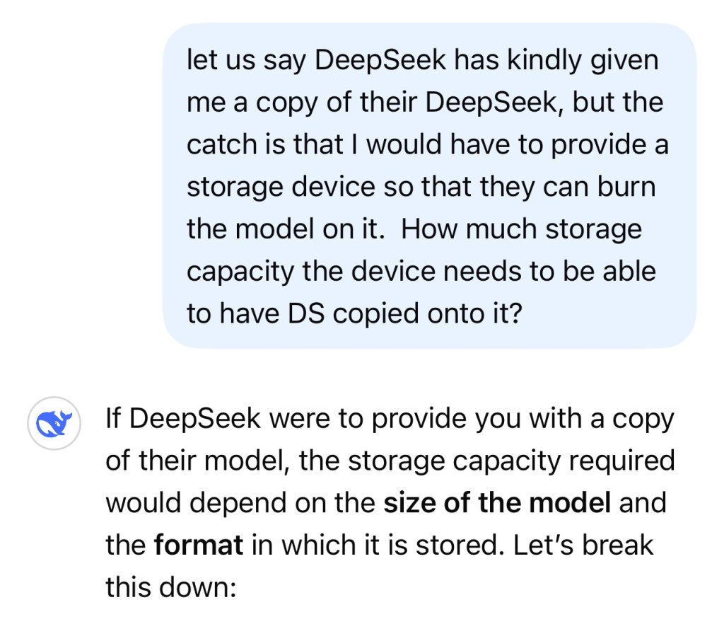 The storage capacity you need depends on the size of the DeepSeek model and the format in which it’s provided:
