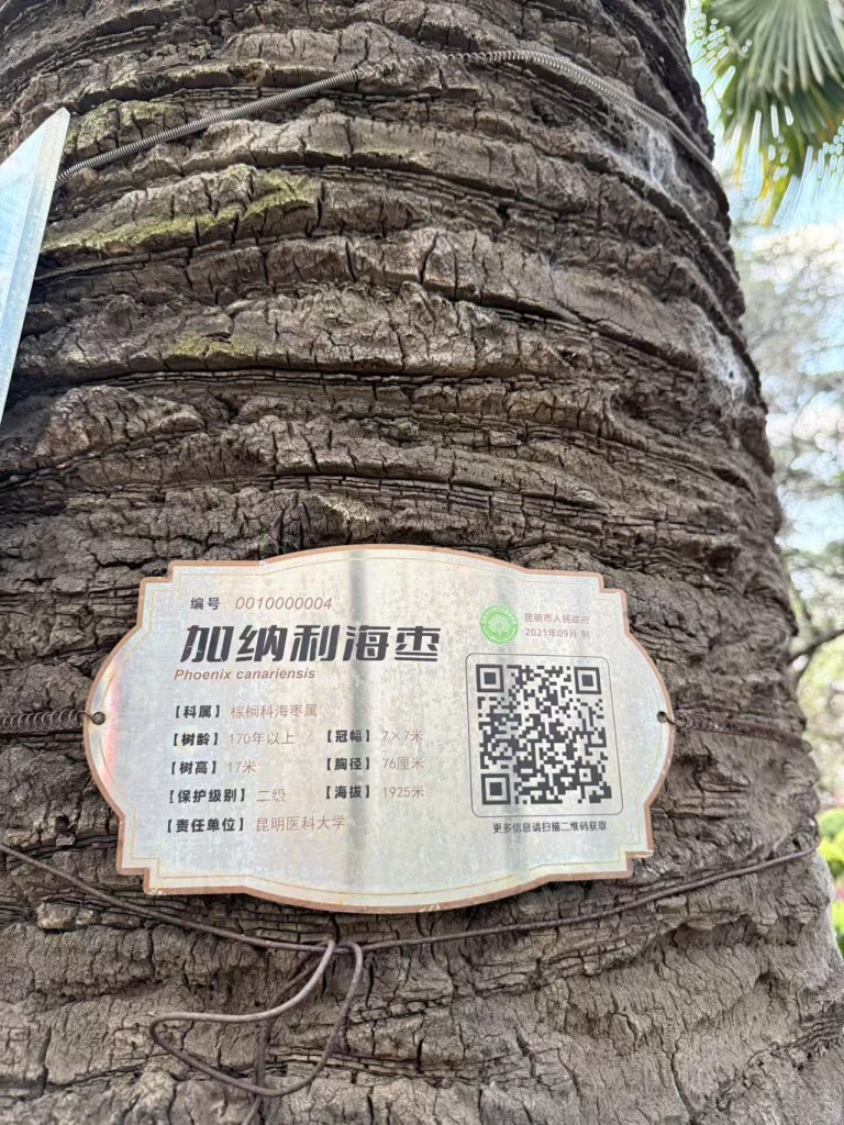 就在这时,教学楼前的小花园里,一棵高大的棕榈树吸引了我的目光。树上挂着一块牌子。我走上前去。牌子是昆明市政府在2021年立的,上面写着: