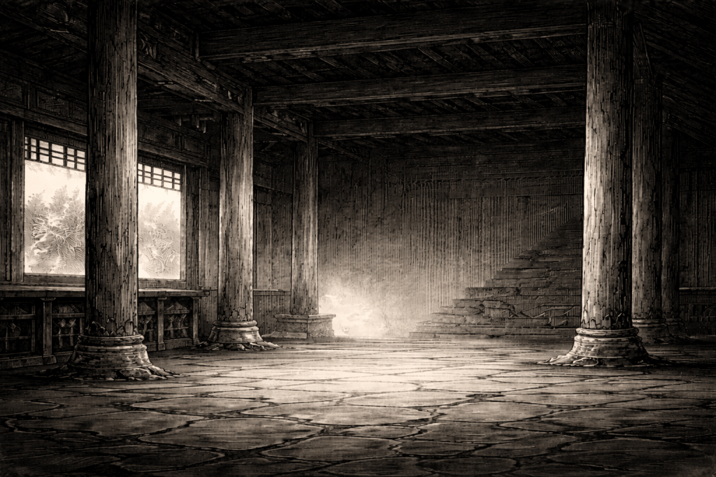 As annoying as the bird calls are, they’re not as bad as the noises that I sometimes hear coming from the second floor of the great hall. There are times when the whole Pavilion compound is just so quiet, when all classes are in session, like when there’s a storm coming, or when Kangyao has an evening self-study session, or when the classes just keep on going and it feels like the teachers are never going to let anyone out. The great hall has very high ceilings, and it’s always kind of dark up there, and I don’t know why, but when you raise your head to look, you can see some beams for sure, but the rest is just darkness. So sometimes I notice there are footsteps upstairs, as if someone is pacing up and down, and it’s kind of creepy. And I can hear that very clearly. And then for days I don’t hear them again, and then I wonder if I had taken rats or some other critters for human footsteps. Anyways, I’ve never told Kangyao about it.